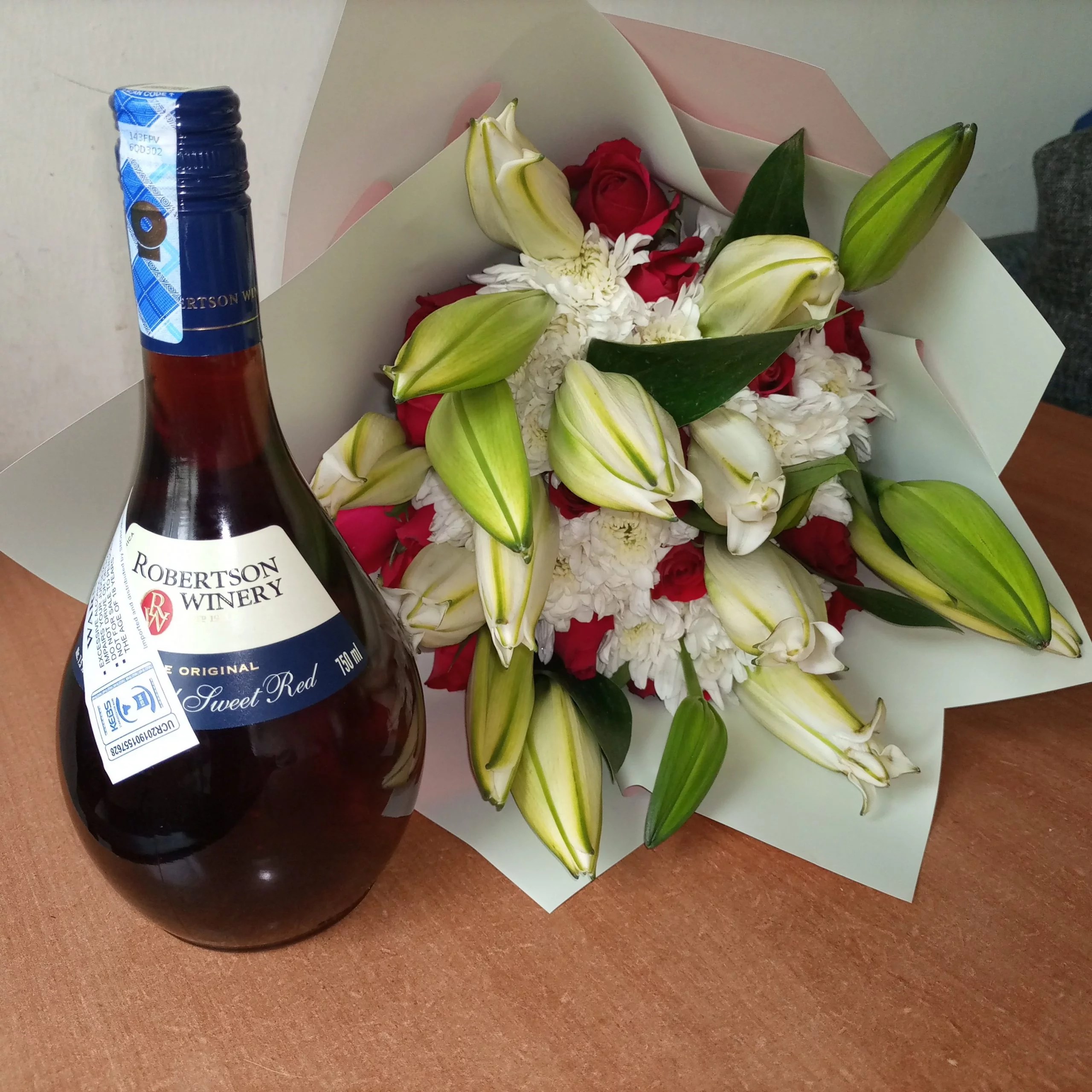 A work of art, flowers arrangement made from a few roses, mums and Lilies, well wrapped. The flowers are complimented by Red Robertson wine.